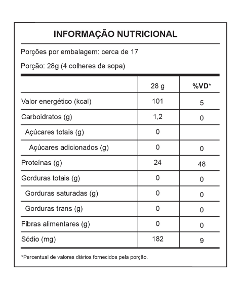 Com 85% de proteína, é naturalmente uma das melhores fontes proteicas da natureza em quantidade e em qualidade, devido ao alto valor biológico (digestibilidade) e aminograma rico em BCAA e outros aminoácidos essenciais. Além disso, os teores de calorias, carboidratos e gorduras são baixíssimos.